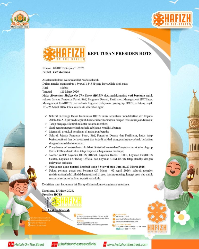 Maka, untuk kenyamanan Seluruh Keluarga Besar Hafizh On The Street (HOTS) dalam menjalankan ibadah dan aktifitas sekitar hari raya, diterbitkan Keputusan Presiden HOTS terkait Cuti Bersama, dalam surat nomor: 01/HOTS/Kepres/III/2026