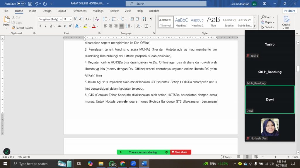 Kegiatan berikutnya yakni rapat online via Zoom pada Ahad (27/7) sore. Sebanyak 5 orang tim HOTSDa Bandung hadir untuk mengevaluasi beberapa kegiatan. Serta persiapan webinar OASIS dan Wisuda Akbar HOTSDa Bandung dalam waktu dekat.
