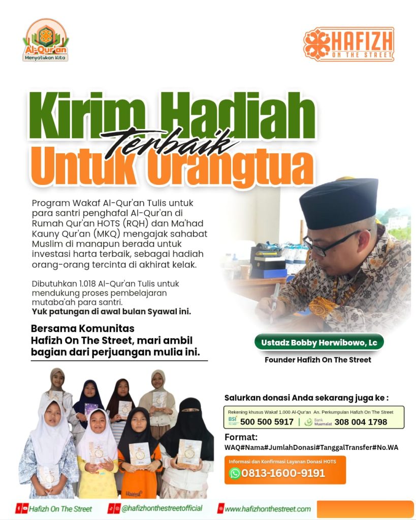 Program Wakaf Al-Qur’an Tulis untuk para santri penghafal Al-Qur’an di Rumah Qur’an HOTS (RQH) dan Ma’had Kauny Qur’an (MKQ) mengajak sahabat Muslim di manapun berada untuk investasi harta terbaik, sebagai hadiah orang-orang tercinta di akhirat kelak.