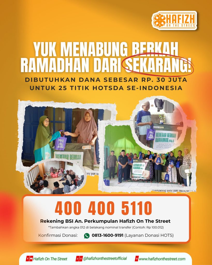 Komunitas Hafizh On The Street (HOTS) mengajak Sahabat Muslim di mana pun berada untuk bersama-sama mempersiapkan diri menyambut Ramadhan. Dengan meningkatkan amal ibadah dan memperbanyak kebaikan sejak sekarang.