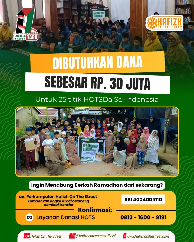 Komunitas Hafizh On The Street (HOTS) mengajak Sahabat Muslim di mana pun berada untuk bersama-sama mempersiapkan diri menyambut Ramadhan. Dengan meningkatkan amal ibadah dan memperbanyak kebaikan sejak sekarang.