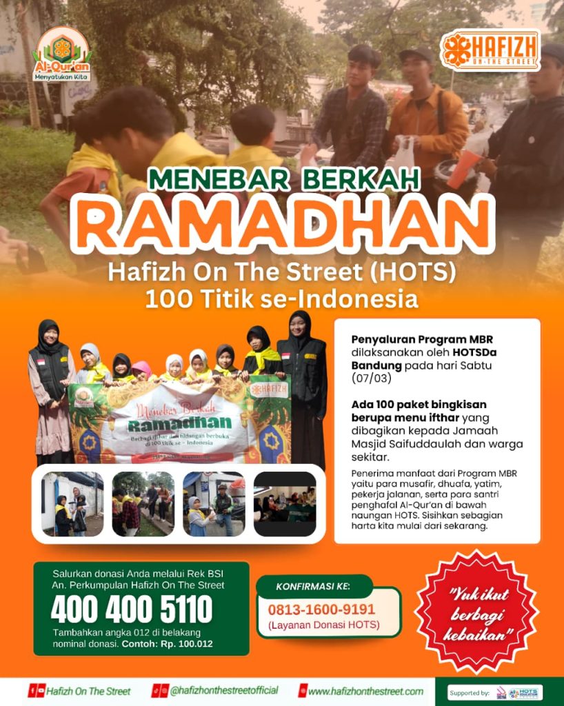 Memasuki 10 hari terakhir bulan Ramadhan, program Menebar Berkah Ramadhan (MBR) kembali dilaksanakan melalui HOTSDa Bandung pada hari Sabtu (07/3) di Masjid Saifuddaulah, Kota Bandung.